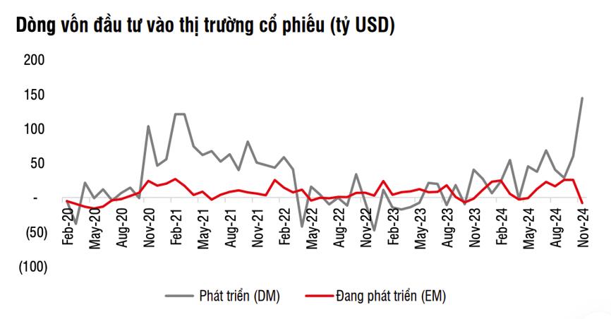 Dòng vốn vào cổ phiếu thị trường đang phát triển (EM) đảo chiều rút ròng. Đồng USD mạnh lên, lo ngại các chính sách thuế quan và tác động tâm lý từ gói kích thích kinh tế của Trung Quốc giảm nhiệt khiến cho dòng vốn rút ròng mạnh mẽ trong tháng 11, với giá trị lên tới 8 tỷ USD, mức rút ròng cao nhất kể từ tháng 6/2020.
