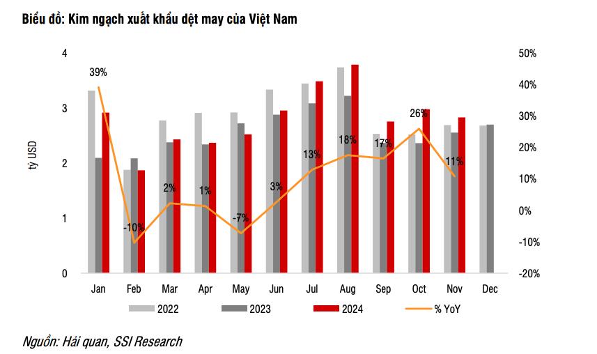 Chuyên gia của SSI cũng đánh giá tích cực đối với ngành, qua việc các công ty có đơn đặt hàng đến hết quý I/2025, cùng với các đơn đặt hàng trước từ các thương hiệu trước khi có điều chỉnh.