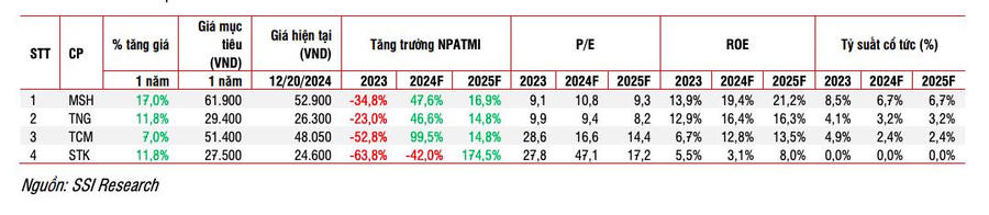 Với nhận định như trên, nhóm cổ phiếu dệt may mà SSI khuyến nghị là MSH, TNG, TCM và STK.