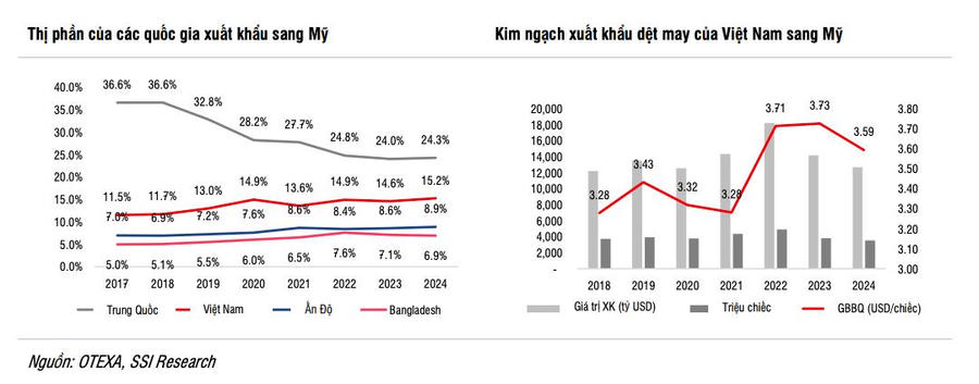 SSI Research nhận định, dệt may là một trong những ngành nhạy cảm nhất trước các mức thuế tiềm ẩn của tổng thống Trump, do Mỹ chiếm hơn 40% kim ngạch xuất khẩu dệt may của Việt Nam.