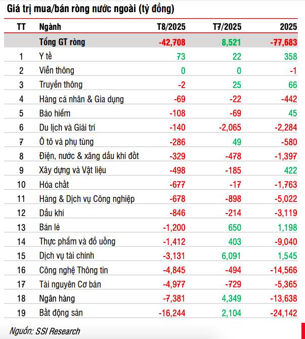 Về giao dịch khối ngoại, Nhà đầu tư nước ngoài bán ròng mạnh trong tháng 8 với giá trị 42,7 nghìn tỷ đồng, trái ngược với mức mua ròng 8,5 nghìn tỷ đồng trong tháng 7, đưa tổng bán ròng từ đầu năm lên 77,7 nghìn tỷ đồng.