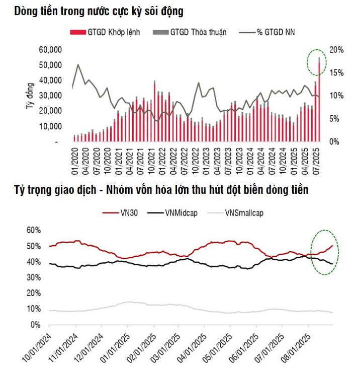 Thanh khoản thị trường tiếp tục bùng nổ, với giá trị giao dịch bình quân đạt 55,1 nghìn tỷ đồng/phiên, tăng gần 40% so với tháng trước. Trong khi đó, tỷ trọng giao dịch của khối ngoại giảm xuống còn 9,7%, so với 10,3% của tháng 7, cho thấy dòng tiền trong nước đang đóng vai trò chủ đạo.
