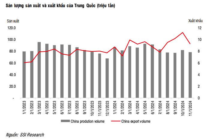 Sản lượng thép nhập khẩu vào Việt Nam trong 11 tháng năm 2024 tăng mạnh 33% svck lên 16,17 triệu tấn, trong đó sản lượng nhập khẩu từ Trung Quốc tăng vọt 48,4% svck và chiếm 68% tổng sản lượng nhập khẩu.
