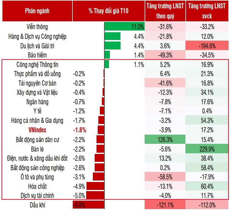 Diễn biến thị trường tháng 10 bị ảnh hưởng lớn từ các yếu tố ngoại vi, khiến thị trường khó đi lên các vùng điểm số cao hơn. Một số nhóm ngành chứng kiến sự giảm điểm rõ rệt: