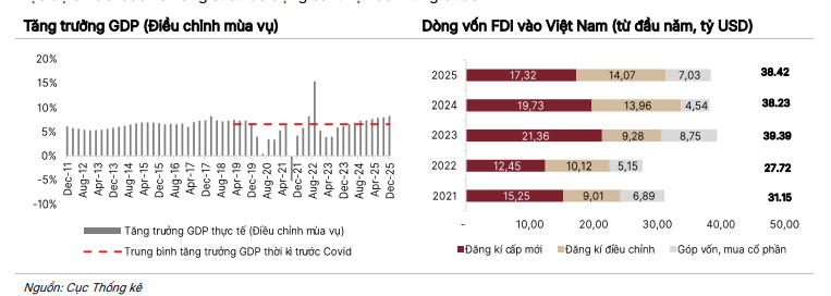 Việt Nam khép lại năm 2025 với mức tăng trưởng GDP thực đạt 8,02% so với cùng kỳ, nhìn chung phù hợp với kỳ vọng và là minh chứng rõ nét cho khả năng chống chịu tốt trong bối cảnh môi trường toàn cầu nhiều thách thức. Đà tăng trưởng được cải thiện rõ rệt về cuối năm, với GDP quý IV/2025 tăng 8,46% svck, nhờ sự phối hợp chặt chẽ hơn trong điều hành vĩ mô và thực thi chính sách quyết liệt hơn trong năm cuối của kế hoạch phát triển kinh tế - xã hội giai đoạn 2021-2025.