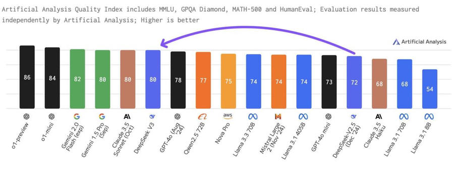 Báo cáo kỹ thuật về V3 cho thấy LLM này vượt trội hơn Llama 3.1 của Meta và Qwen 2.5 của Alibaba Group Holding trong một loạt các bài kiểm tra đánh giá khả năng hiểu và tạo văn bản, kiến thức chuyên gia, lập trình và giải quyết vấn đề toán học.