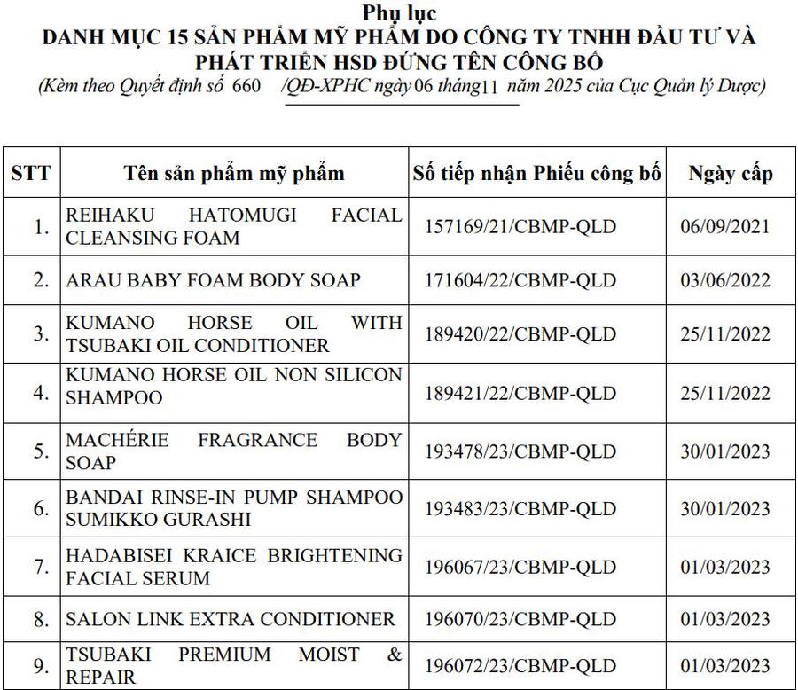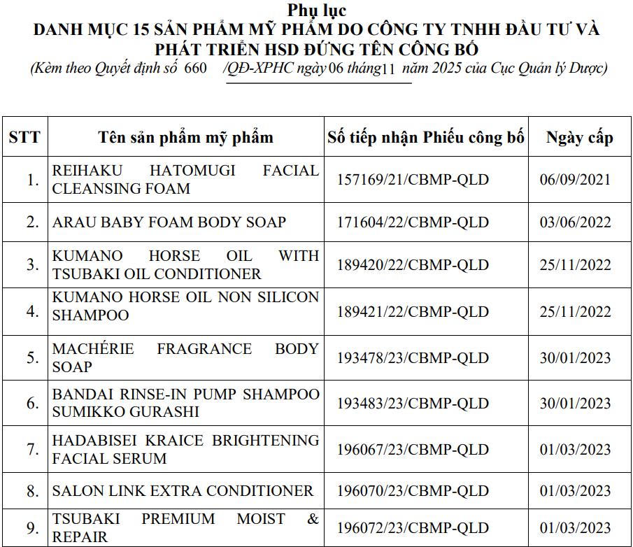 Công ty TNHH Đầu tư và Phát triển HSD bị xử phạt 75 triệu đồng và buộc thu hồi, tiêu hủy 15 sản phẩm mỹ phẩm vi phạm, trong đó có các thương hiệu nổi tiếng như Hatomugi Reihaku, Tsubaki, Kumano, Arau Baby…