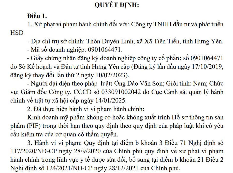 Theo quyết định, Công ty HSD đã kinh doanh 15 sản phẩm mỹ phẩm không có hoặc không xuất trình được Hồ sơ thông tin sản phẩm (PIF) trong thời hạn theo quy định. Đây được xác định là tình tiết tăng nặng do có nhiều sản phẩm vi phạm cùng hành vi tại cùng thời điểm kiểm tra.