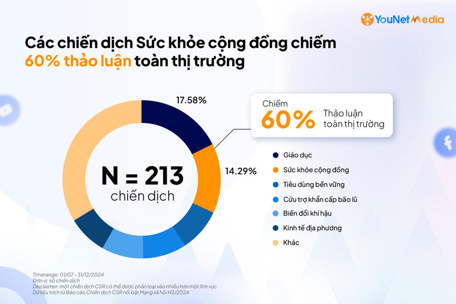 YouNet Media ghi nhận có tổng cộng 213 chiến dịch CSR được truyền thông trên mạng xã hội trong nửa cuối năm 2024, tăng 35% so với nửa đầu năm. Trong đó, gần 70% chiến dịch tập trung vào các vấn đề xã hội như sức khỏe, giáo dục và xóa nghèo, chiếm đến 82% lượng thảo luận trên toàn thị trường.