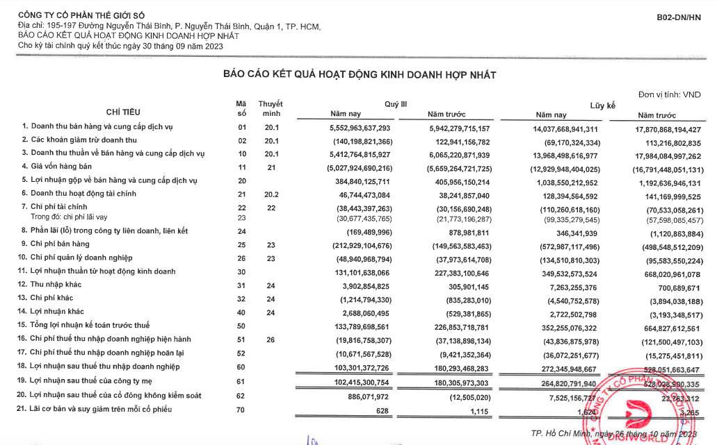Báo cáo tài chính hợp nhất quý III/2023 của Công ty cổ phần Thế Giới Số (Digiworld, mã ck: DGW) ghi nhận kết quả kinh doanh không mấy khả quan.
