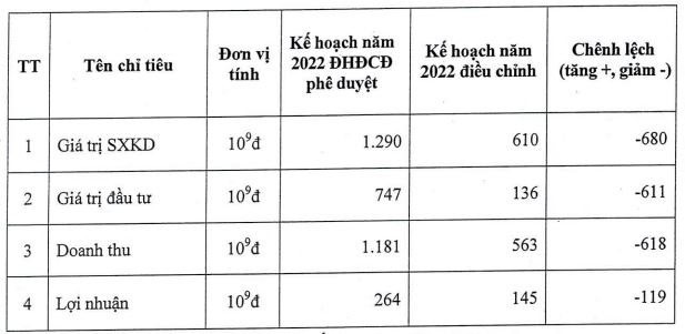Chỉ tiêu doanh thu hợp nhất được điều chỉnh giảm 52% so với ban đầu, xuống mức 563 tỷ đồng. Kế hoạch lợi nhuận trước thuế hợp nhất năm 2022 cũng được điều chỉnh giảm 45% từ 264 tỷ đồng xuống còn 145 tỷ đồng.