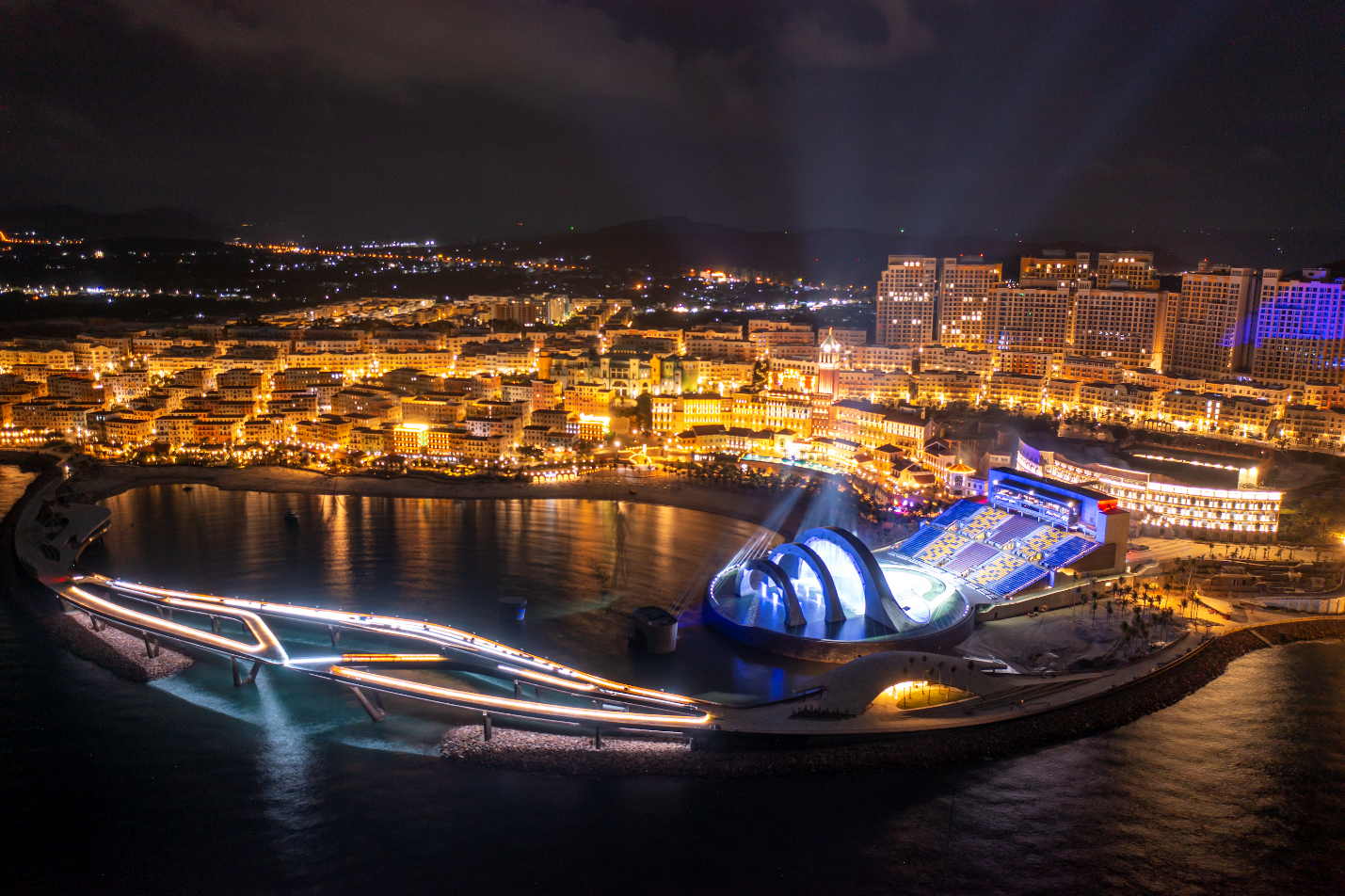 Đêm Sunset Town cũng là sự bùng nổ của cảm xúc, với show trình diễn đa phương tiện trên màn nước biển lớn nhất châu Á- Kiss The Stars. Sự kết hợp đỉnh cao giữa lửa, nước, ánh sáng, laser, âm nhạc, pháo hoa… trong show diễn, với phông nền là Cầu Hôn phía sau khi được thắp sáng trong đêm, tạo nên một phối cảnh như thể chốn thiên hà trên mặt biển Phú Quốc.