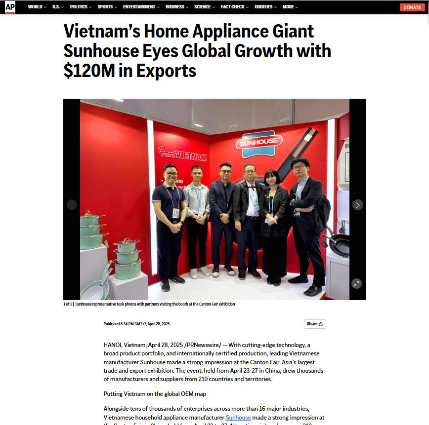 Tiêu biểu, ngày 28/4, hãng thông tấn AP News đăng tải bài viết với tiêu đề: “Sunhouse - gã khổng lồ gia dụng Việt đặt mục tiêu tăng trưởng toàn cầu, xuất khẩu 120 triệu USD”, khẳng định vị thế vươn tầm của một doanh nghiệp Việt Nam trong lĩnh vực gia dụng. AP News là một trong những hãng tin lâu đời có trụ sở tại New York (Mỹ), với mạng lưới độc giả tại hơn 200 quốc gia và vùng lãnh thổ, đánh giá cao định hướng chiến lược của Sunhouse trong nỗ lực xây dựng thương hiệu toàn cầu.