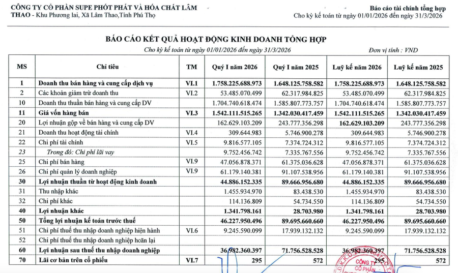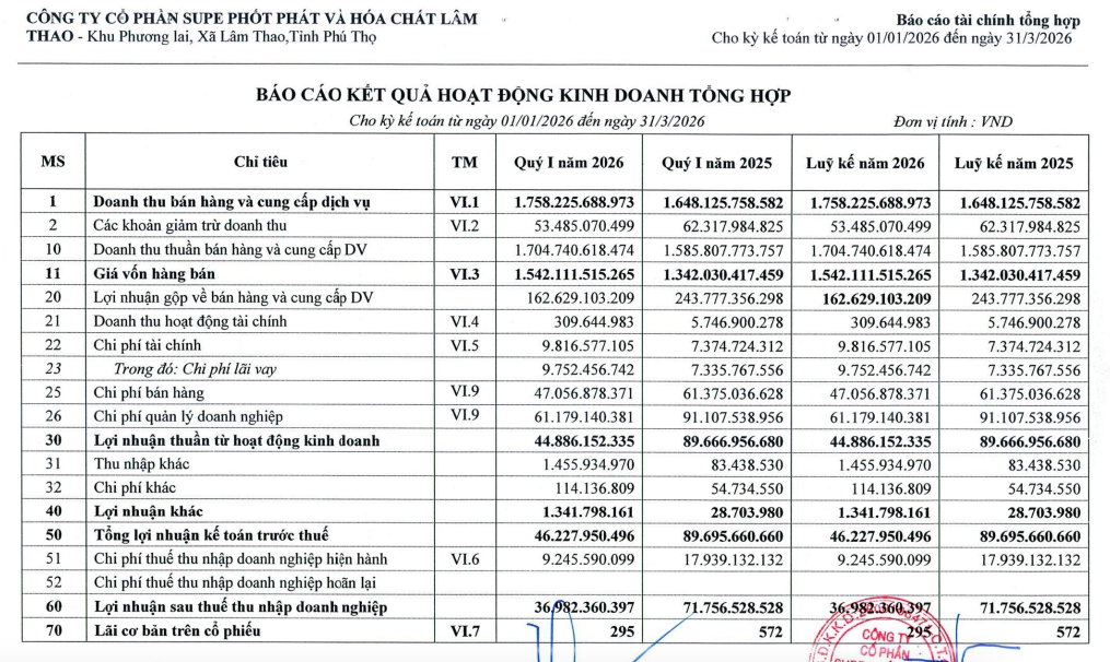 CTCP Supe Phốt phát và Hóa chất Lâm Thao (mã ck: LAS) vừa công bố báo cáo tài chính quý I/2026.
