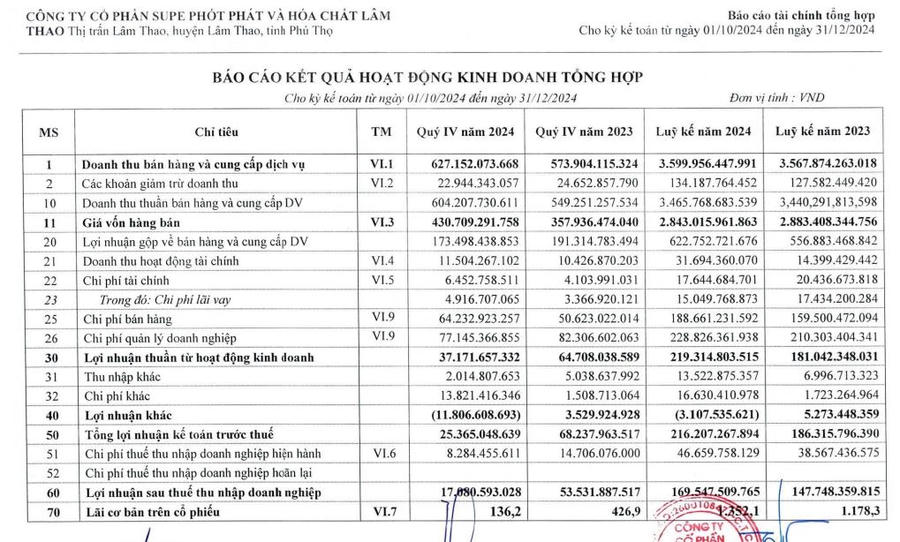 Supe Phốt Phát và Hóa chất Lâm Thao (LAS) báo lãi quý IV/2024 giảm mạnh 68%