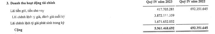 Trong quý, doanh thu hoạt động tài chính ghi nhận tăng gấp 8,6 lần, lên mức 5,9 tỷ đồng. Chủ yếu do doanh nghiệp có thêm 3,87 tỷ đồng lãi chênh lệch tỷ giá và 1,67 tỷ đồng lãi chênh lệch tỷ giá phát sinh trong kỳ.