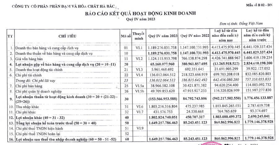 Theo báo cáo tài chính của Công ty cổ phần Phân đạm và Hóa chất Hà Bắc (Đạm Hà Bắc, mã ck: DHB), trong quý IV/2023, doanh nghiệp thu về 1.189,2 tỷ đồng doanh thu thuần, tăng 3,6% so với cùng kỳ năm trước.