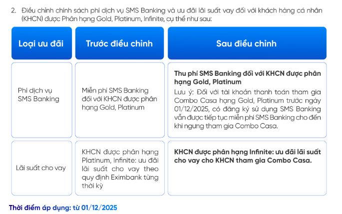 Eximbank cũng cho biết bắt đầu thu phí SMS Banking đối với khách hàng hạng Gold và Platinum với mức 90.000 đồng/quý/thuê bao; riêng nhóm khách hàng này nếu sử dụng gói Combo Casa sẽ được miễn phí.