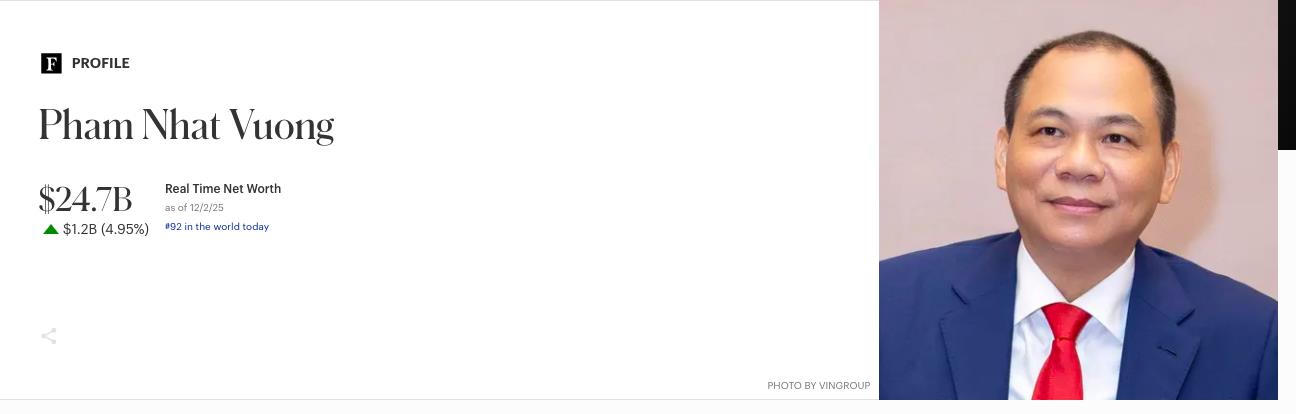Theo thông tin Forbes cập nhật ngày 2/12, tài sản ròng của ông Phạm Nhật Vượng - Chủ tịch HĐQT Vingroup - đã tăng vọt lên mức 24,7 tỷ USD, tức tăng thêm 1,2 tỷ USD trong 24 giờ qua.