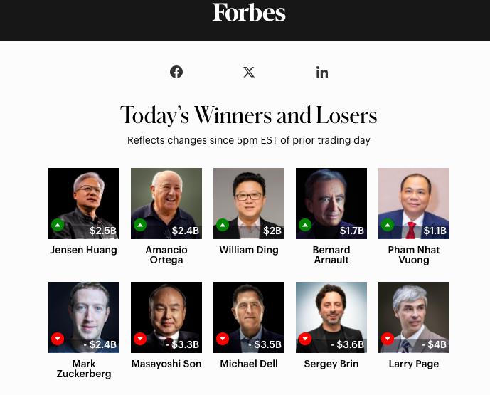 Tính riêng phiên giao dịch hôm nay, ông Phạm Nhật Vượng cũng lọt top 5 tỷ phú gia tăng khối tài sản nhiều nhất thế giới, cùng với CEO Nvidia Jensen Huang (tăng thêm 2,5 tỷ USD); ông chủ Zara Amancio Ortega (tăng 2,2 tỷ USD); CEO công ty trò chơi NetEase William Ding (tăng 2 tỷ USD); tỷ phú Bernard Arnault tăng 1,1 tỷ USD.