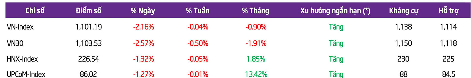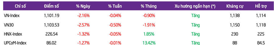 Trong phiên cuối tuần, các chỉ số điều chỉnh mạnh do thông tin tiêu cực liên quan tới nhóm Vingroup và hoạt động chốt lời của nhà đầu tư. Kết thúc tuần giao dịch đầy biến động, chỉ số VN-Index chốt tại 1.101,2 điểm, tương đương mức giảm nhẹ 0,1% so với cuối tuần trước; chỉ số HNX-Index ghi nhận mức giảm 0,1% xuống 226,54 điểm và UPCoM-Index chỉ giảm 0,01% để đóng cửa tại 86,02 điểm.
