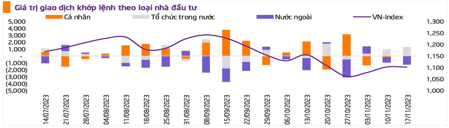Tín hiệu tích cực của thị trường đến từ thanh khoản khi giá trị giao dịch bình quân phiên trên cả 3 sàn tiếp tục tăng nhẹ 4,6% so với tuần trước, đạt 21.243 tỷ đồng/phiên. Khối ngoại tiếp tục bán ròng khi VN-Index ở trên vùng giá 1.110 điểm. Nhà đầu tư ngoại tăng cường bán ròng trên HOSE với giá trị tuần này đạt 1.346 tỷ đồng (+11% so với tuần trước). Xu hướng mua ròng trên HNX và UPCoM đảo chiều trong tuần này sau khi khối ngoại ghi nhận giá trị bán ròng lần lượt 118 tỷ và 86 tỷ đồng.