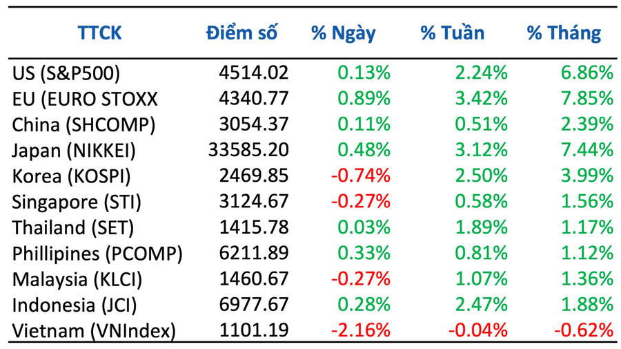 Trên thị trường tài chính toàn cầu, CPI hạ nhiệt tiếp tục hỗ trợ cho lợi tức trái phiếu chính phủ Mỹ (kỳ hạn 10 năm giảm 0,2% trong tuần và 0,5% trong tháng về mức 4,39%) và DXY (về mức 104 điểm, giảm 1,5% trong tuần và 2,1% trong tháng) giảm qua đó giúp cho chứng khoán tăng điểm. Các chỉ số chứng khoán Mỹ tăng bình quân trên 2% ngay khi mùa công bố thông tin kết quả kinh doanh đang khép lại.
