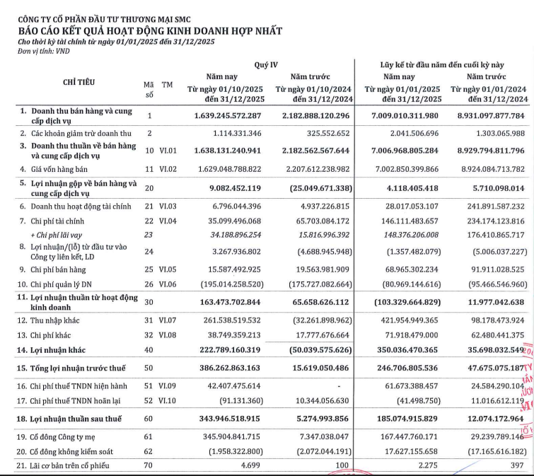 Luỹ kế trong năm 2025, Đầu tư Thương mại SMC ghi nhận doanh thu đạt 7.006 tỷ đồng, giảm 21,5% so với cùng kỳ; lợi nhuận sau thuế ghi nhận lãi 185 tỷ đồng , tăng cao so với cùng kỳ lãi 12,07 tỷ đồng.