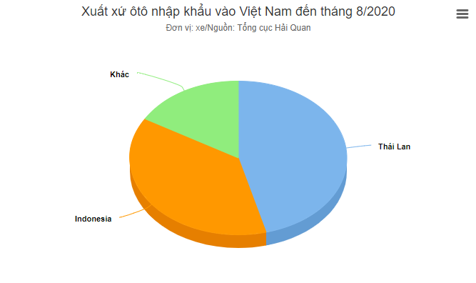 Về nguồn gốc xuất khẩu, Thái Lan và Indonesia tiếp tục là hai quốc gia chiếm tỷ trọng lớn nhất, hơn 80%. Trong đó, xe xuất xứ Thái Lan sau 8 tháng 2020 có chiều hướng giảm, xe Indonesia ngược lại tăng so với 2019.