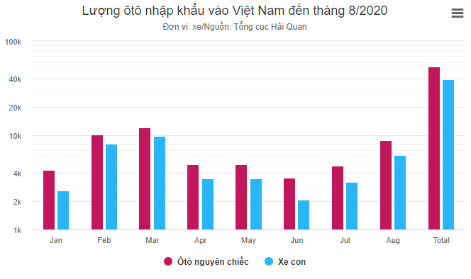 Lũy kế từ đầu 2020, lượng xe nhập về Việt Nam đạt 53.812 chiếc, giảm 44,3% so với cùng kỳ 2019. Trong đó, ô tô con 9 chỗ ngồi trở xuống là 39.588 chiếc, giảm 46,9%; ô tô vận tải 10.759 chiếc, giảm 47,8%. Ảnh hưởng của dịch bệnh khiến sản lượng các nhà máy tại nước ngoài lẫn nhu cầu trong nước đều giảm là lý do chính khiến lượng xe nhập khẩu giảm mạnh.