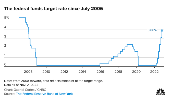 Với việc tiếp tục nâng lãi suất thêm 0,75%, lãi suất chuẩn của Ngân hàng Trung ương Mỹ đang ở 3,75-4%. Giới quan sát nhận định, Fed sẽ nhẹ tay hơn trong cuộc họp tháng 12.