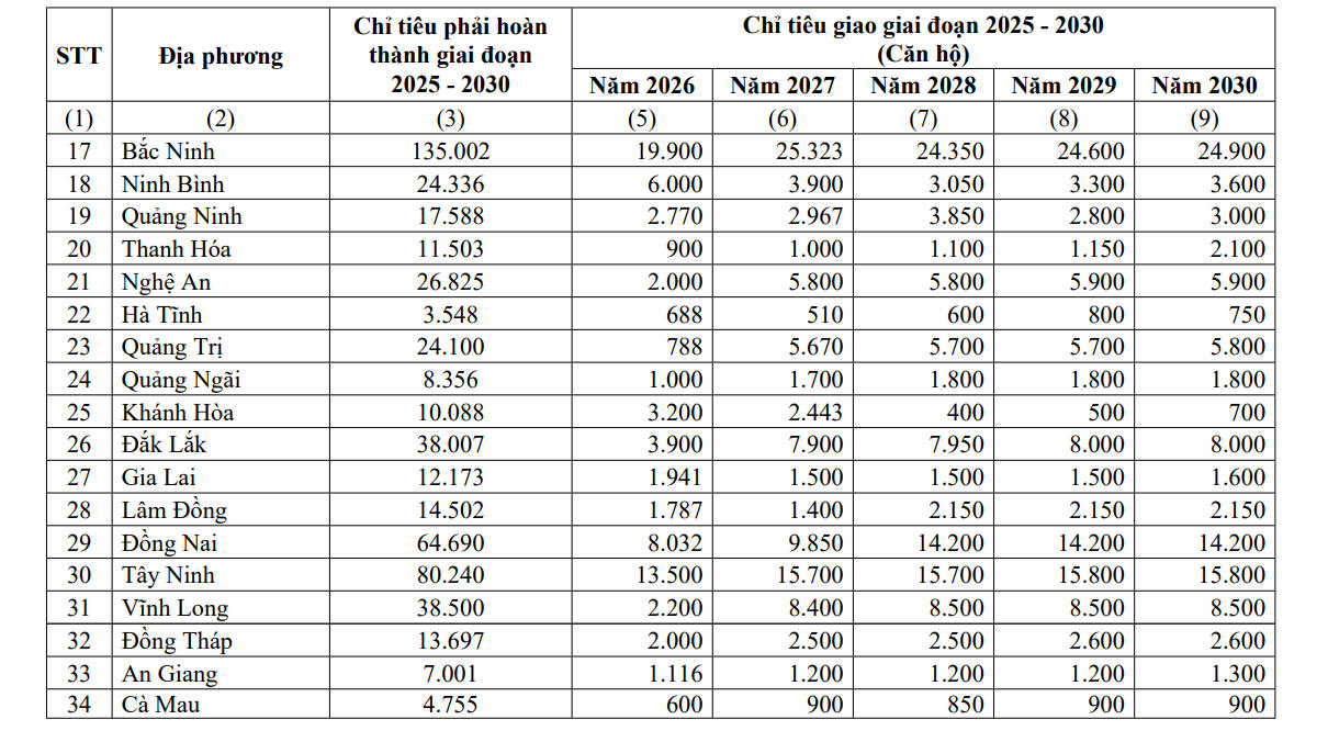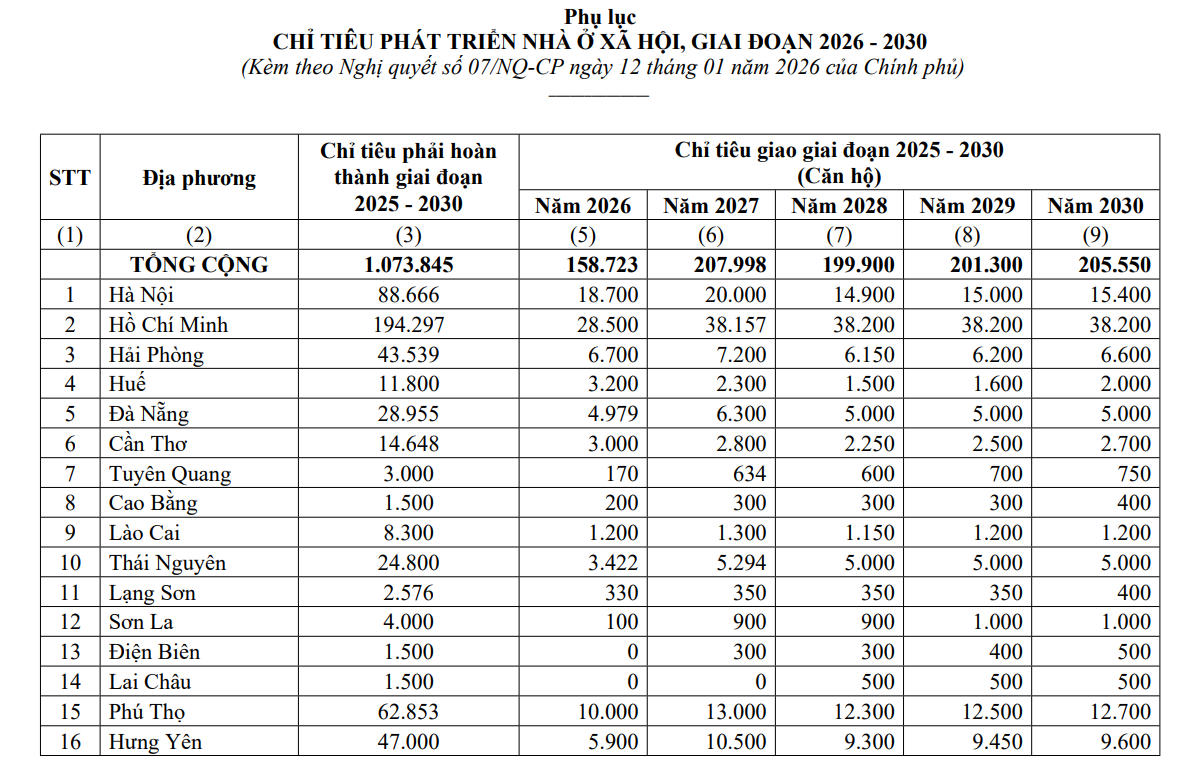 Chính phủ vừa ban hành Nghị quyết số 7/NQ-CP, giao chỉ tiêu phát triển nhà ở xã hội cho các địa phương giai đoạn 2026 - 2030, nhằm đạt mục tiêu ít nhất 1 triệu căn hộ cho người thu nhập thấp và công nhân khu công nghiệp đến năm 2030.
