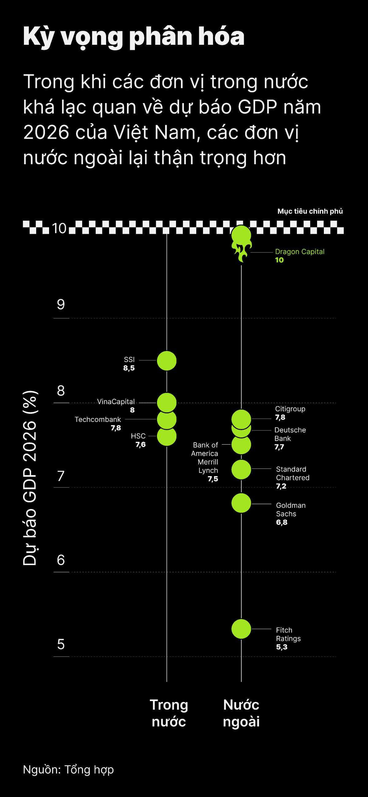 Tuy nhiên, vẫn có sự ngoại lệ trong nhóm các tổ chức nước ngoài. Dragon Capital, quỹ đầu tư có thâm niên hơn 30 năm tại thị trường Việt Nam, đưa ra mức dự báo lạc quan nhất lên tới 10%. Tại tọa đàm ngày 29/11 vừa qua, ông Dominic Scriven, Chủ tịch Dragon Capital nhận định dư địa tăng trưởng đến từ quá trình chính thức hóa khu vực kinh tế phi chính thức. Việc đưa khoảng 5 triệu hộ kinh doanh cá thể vào hệ thống quản lý thông qua hóa đơn điện tử và thanh toán ngân hàng được kỳ vọng đóng góp thêm một điểm phần trăm GDP mỗi năm trong ba năm tới, tạo cơ sở cho kịch bản tăng trưởng hai con số.