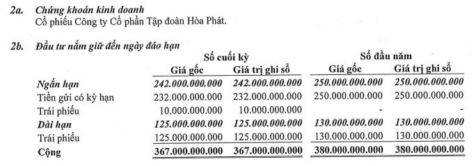 Các khoản đầu tư nắm giữ đến ngày đáo hạn của Công ty ở mức 367 tỷ đồng, giảm 3% so với đầu năm, bao gồm tiền gửi có kỳ hạn 232 tỷ đồng và các trái phiếu 135 tỷ đồng.