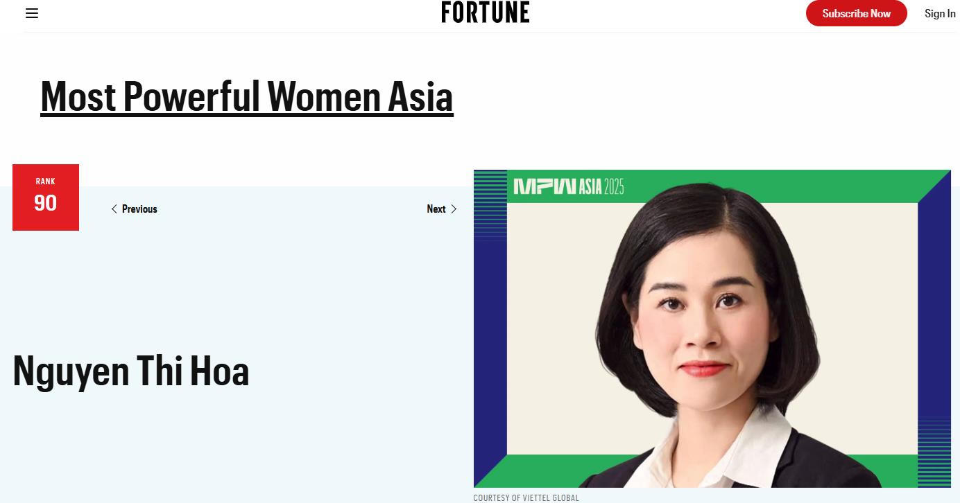 Trong lĩnh vực viễn thông có đại diện là bà Nguyễn Thị Hoa, Tổng Giám đốc Viettel Global, đứng ở vị trí thứ 90 trong bảng xếp hạng.