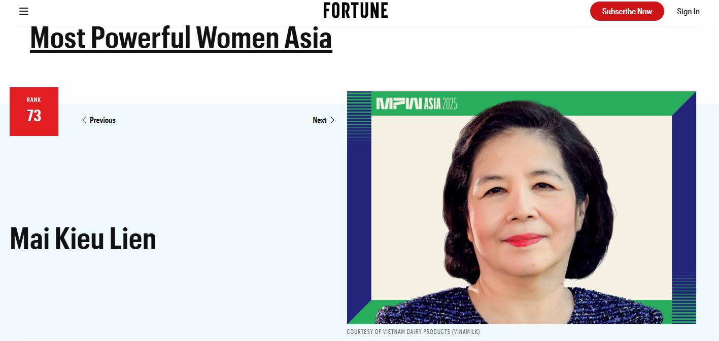 Fortune đánh giá vai trò của bà trong việc điều hành Vinamilk từ năm 1992, đưa doanh nghiệp này trở thành công ty thực phẩm và đồ uống niêm yết lớn nhất trên sàn chứng khoán TP.HCM với vốn hóa 4,9 tỷ USD.
