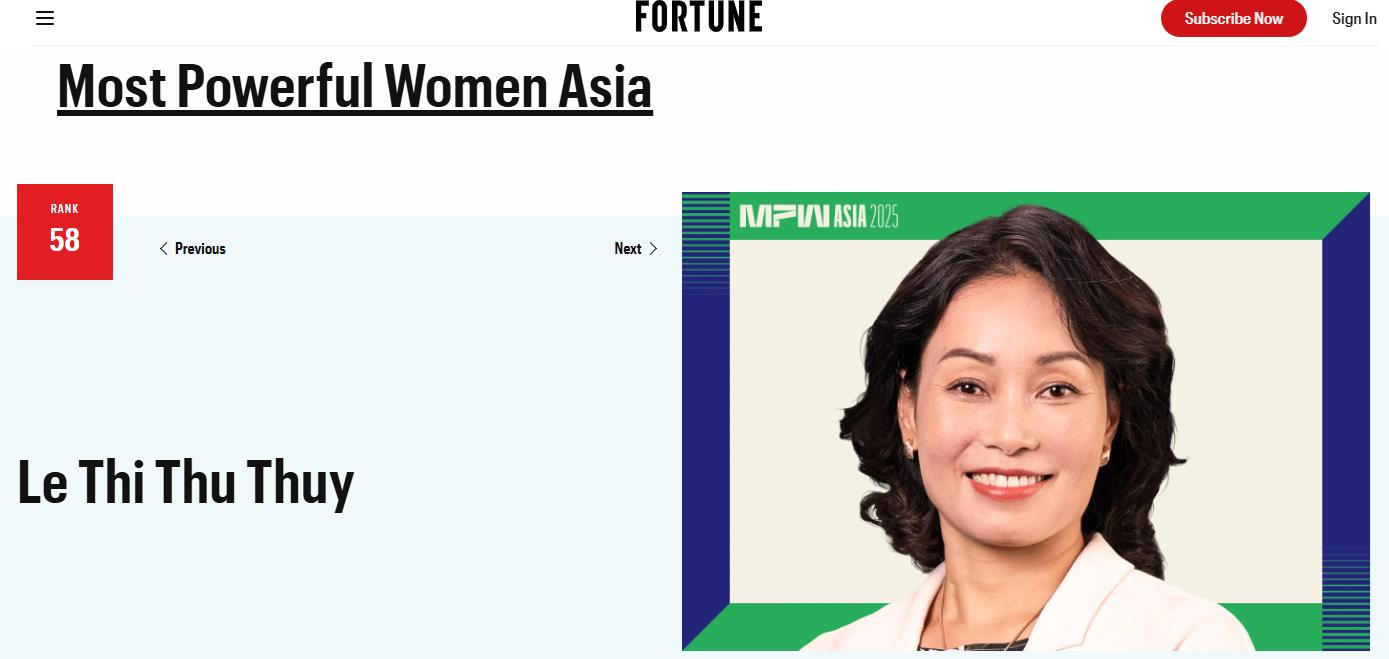 Tạp chí Fortune (Mỹ) vừa công bố danh sách "100 Phụ nữ Quyền lực nhất châu Á" năm 2025 (Fortune Most Powerful Women Asia 2025), ghi nhận sự góp mặt của bốn nữ lãnh đạo đến từ Việt Nam. Đây đều là những nữ lãnh đạo có ảnh hưởng lớn trong việc định hình doanh nghiệp, thúc đẩy đổi mới, truyền cảm hứng cho thế hệ kế tiếp.