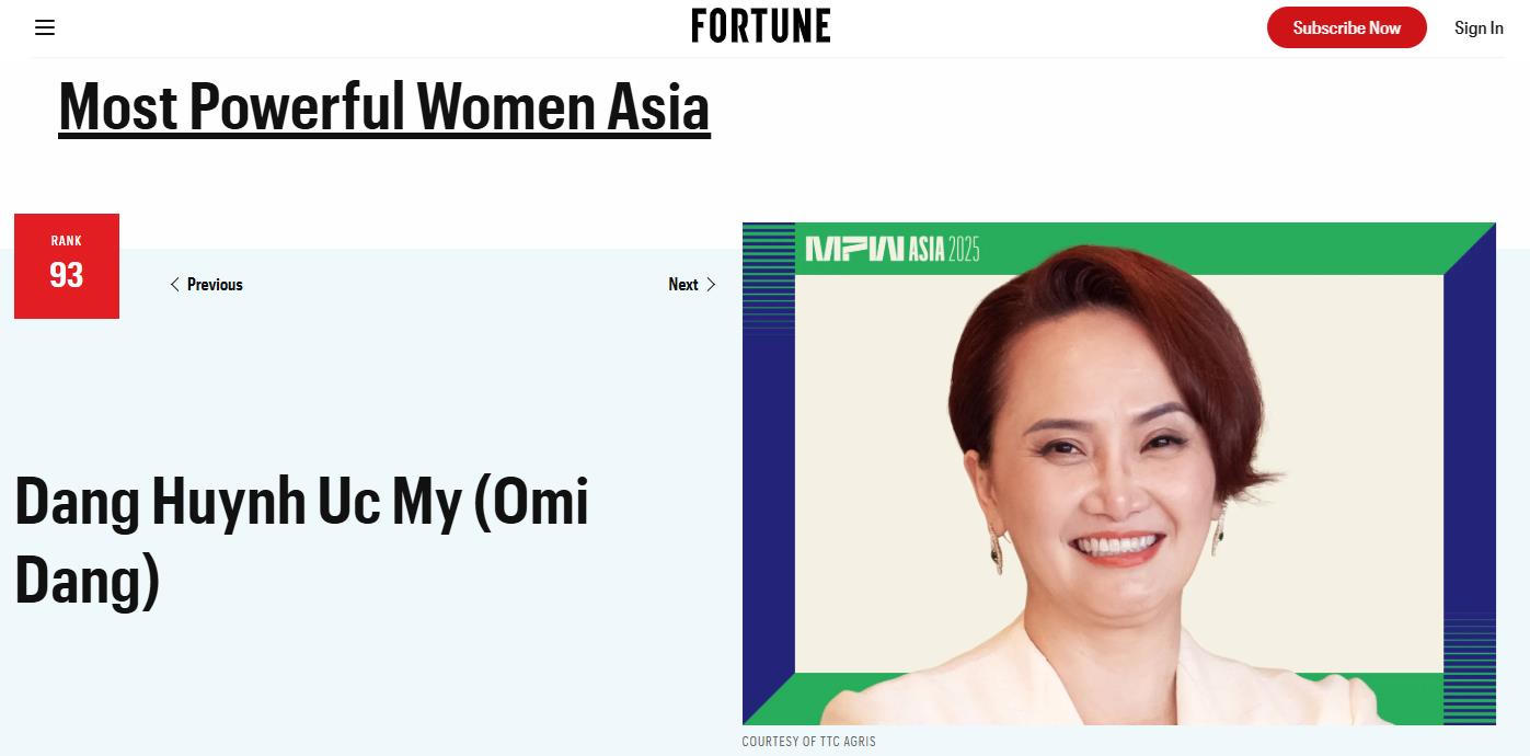 Bà được Fortune ghi nhận nhờ tư duy chiến lược và cam kết phát triển bền vững. Bà đã kiến tạo hướng đi mới cho AgriS, chuyển đổi từ mô hình sản xuất truyền thống sang một nền tảng cung cấp giải pháp nông nghiệp thông minh.