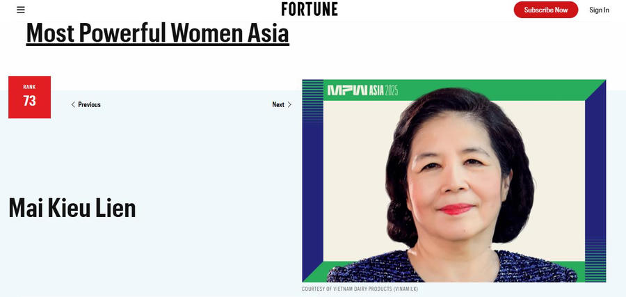 Tiếp theo là bà Mai Kiều Liên - Tổng Giám đốc Vinamilk, ở vị trí thứ 73. Việc bà tiếp tục có mặt trong danh sách cho thấy sự ghi nhận bền bỉ đối với những đóng góp của bà cho ngành sữa Việt Nam.