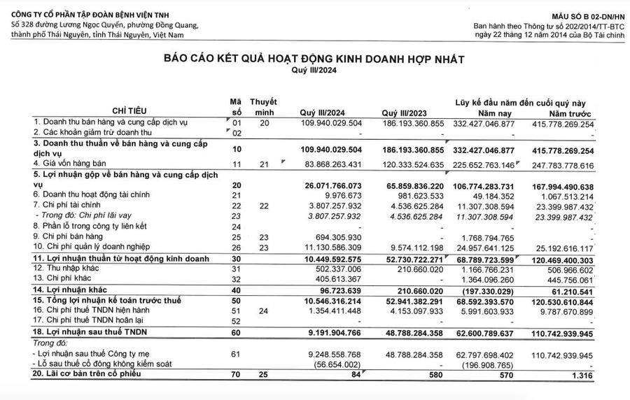 Về kết quả kinh doanh, theo báo cáo tài chính hợp nhất quý III/2024, Công ty Tập đoàn Bệnh viện TNH ghi nhận doanh thu thuần đạt 109,9 tỷ đồng, giảm 41% so với cùng kỳ năm ngoái.