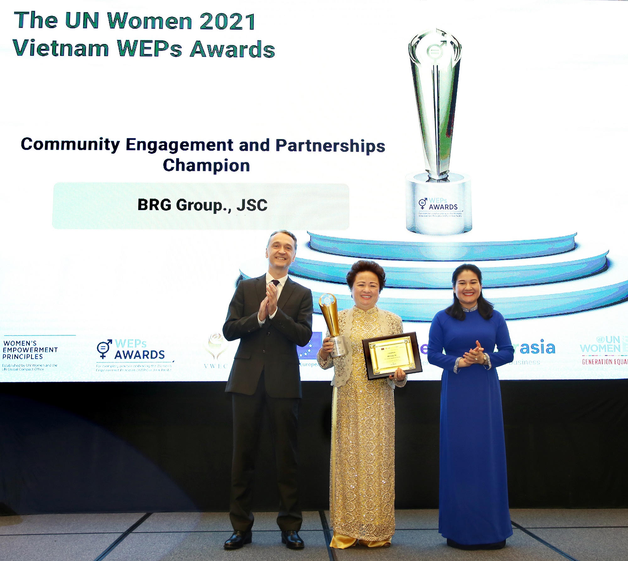 Ngày 22/10/2021, Tập đoàn BRG đã vinh dự nhận giải Nhất hạng mục “Bình đẳng giới thông qua tham gia của cộng đồng và quan hệ đối tác” tại Giải thưởng Trao quyền cho phụ nữ (WEPs 2021). Trong số rất nhiều doanh nghiệp trong và ngoài nước tham gia giải thưởng, Tập đoàn BRG là doanh nghiệp duy nhất tại Việt Nam được vinh danh ở hạng mục này.