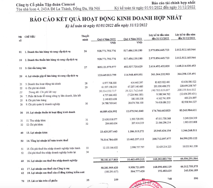 Tập đoàn Cienco4 (C4G) lãi quý IV/2022 58 tỷ đồng, gấp gần 6 lần so với cùng kỳ