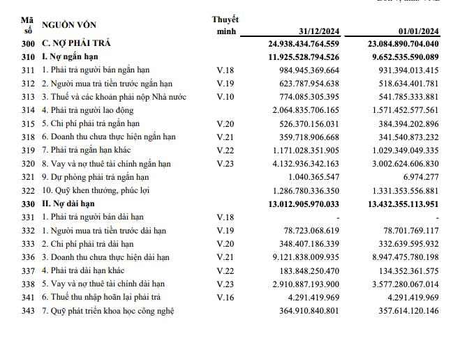 Tuy nhiên, tập đoàn cũng ghi nhận khoản vay nợ lớn. Tổng nợ vay tài chính ngắn hạn và dài hạn lên tới 7.042 tỷ đồng, tăng 463 tỷ đồng so với thời điểm 1/1/2024, trong đó có tới 2.910 tỷ đồng là nợ vay dài hạn.