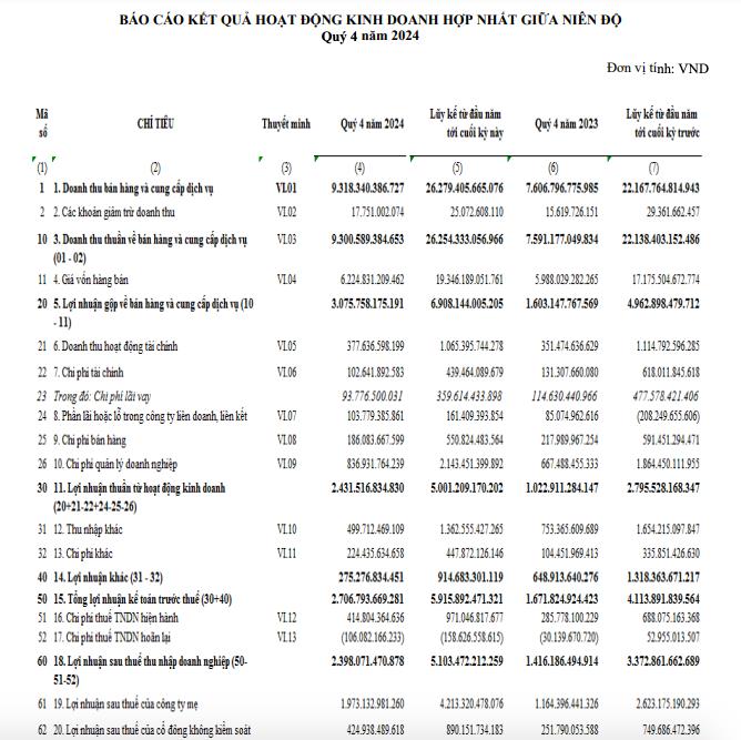 Tập đoàn Công nghiệp Cao su Việt Nam - CTCP (mã ck: GVR) vừa công bố báo cáo tài chính hợp nhất quý IV/2024 với nhiều điểm nhấn đáng chú ý.