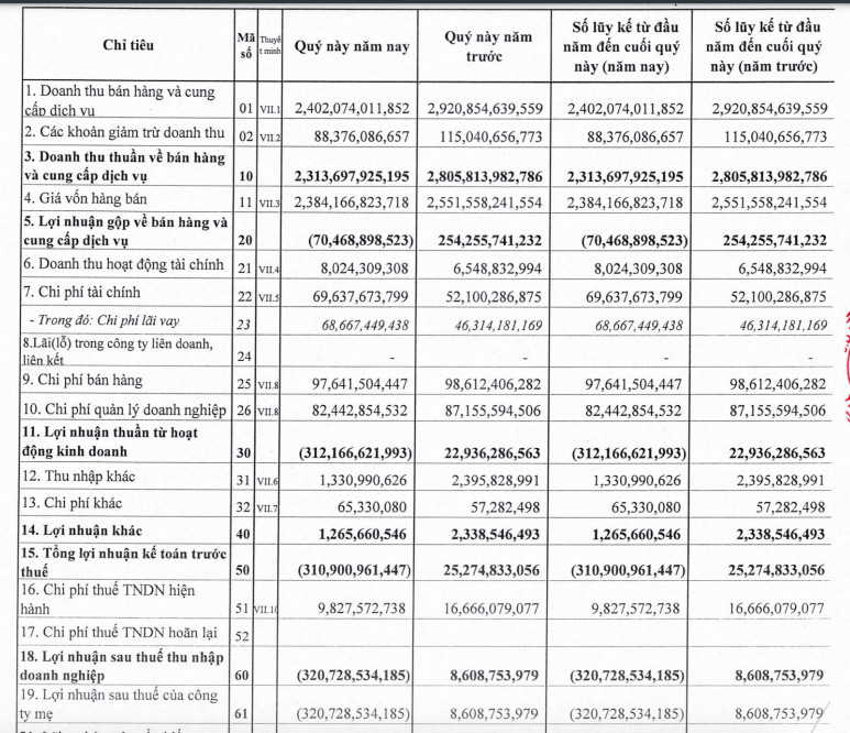 Kinh doanh dưới giá vốn, điều này khiến DBC lỗ gộp hơn 70 tỷ đồng, trong khi cùng kỳ lãi 254 tỷ đồng.