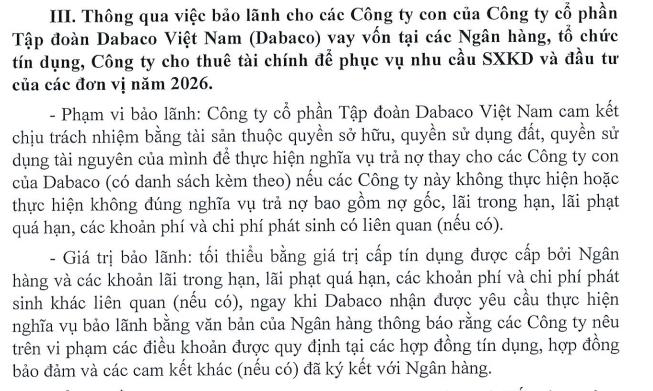 Dabaco thông qua việc bảo lãnh cho các Công ty con vay vốn phục vụ nhu cầu sản xuất kinh doanh và đầu tư năm 2026. Dabaco cam kết chịu trách nhiệm trả nợ thay (gốc, lãi, phí) bằng tài sản thuộc sở hữu của Công ty nếu các công ty con không thực hiện đúng nghĩa vụ trả nợ.