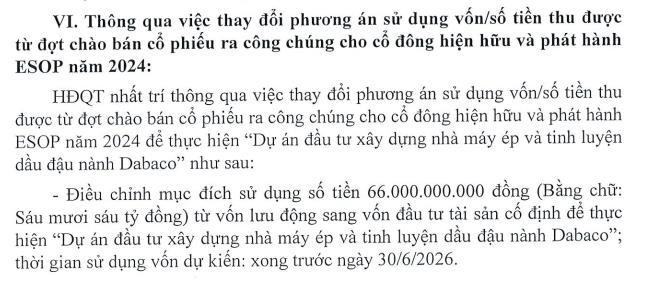 Theo nội dung thay đổi, Doanh nghiệp chuyển đổi mục đích sử dụng số tiền 66 tỷ đồng từ vốn lưu động sang vốn đầu tư tài sản cố định để thực hiện Dự án đầu tư xây dựng nhà máy ép và tinh luyện dầu đậu nành Dabaco. Thời gian sử dụng vốn dự kiến xong trước 30/06/2026.