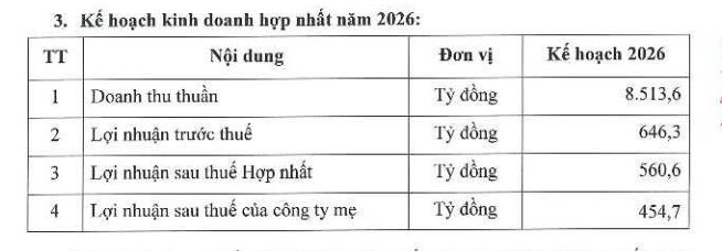 Bước sang năm 2026, công ty đặt mục tiêu doanh thu đạt 8.513 tỷ đồng, tăng gần 90% so với kết quả thực hiện năm 2025. Lợi nhuận sau thuế dự kiến đạt 560,6 tỷ đồng, tăng 26% so với năm trước.