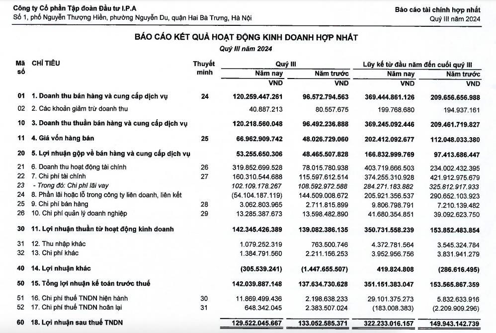 Lũy kế trong 9 tháng đầu năm 2024, Đầu tư I.P.A ghi nhận doanh thu đạt 369,2 tỷ đồng, tăng 76,3% so với cùng kỳ và lợi nhuận sau thuế đạt 322,05 tỷ đồng, tăng 114,8% so với cùng kỳ năm trước.