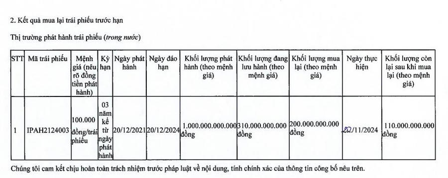 Với số tiền huy động được, Công ty dự kiến dùng 400 tỷ đồng để trả nợ trái phiếu mã IPAH2124002 sẽ đáo hạn ngày 15/11/2024; còn lại 200 tỷ đồng sẽ trả trái phiếu mã IPAH2124003 sẽ đáo hạn ngày 20/12/2024. Đây là trái phiếu không chuyển đổi, không kèm chứng quyền, không có bảo đảm và không phải khoản nợ thứ cấp của doanh nghiệp.